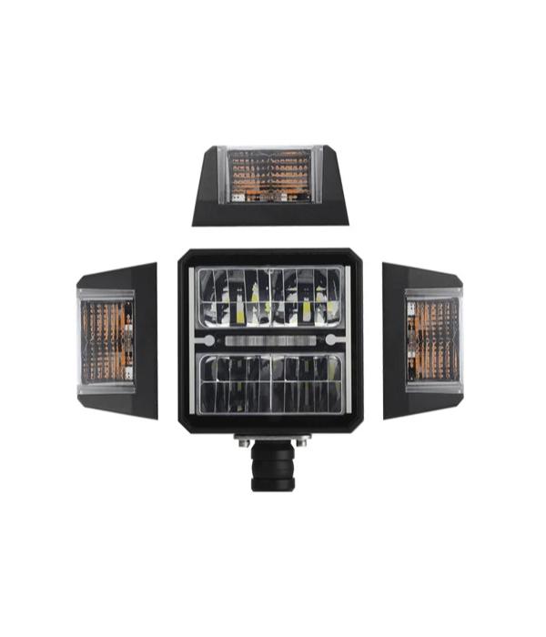 Plogljus 12/24V, halvljus 24W/1800lm – helljus 48W/3600lm, positionsljus 3W, blinker 12W, automatisk uppvärmd lins 22W, 5700K, 6-pin DT, IP68, R112/R6/R7/R10 fäste under huset eller baksidan. Mått: 215x150x85mm innehåller lös dt 6 skarvkontakt